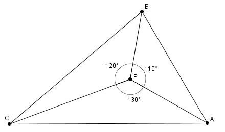 Sea P un punto interior al triángulo ABC tal que la recta AP es la bisectriz del ángulo BAC, BP es la bisectriz de ABC y CP es la bisectriz de ACB. Si APB=110º, BPC=120º y CPA=130º, hallar los ángulos del triángulo ABC.